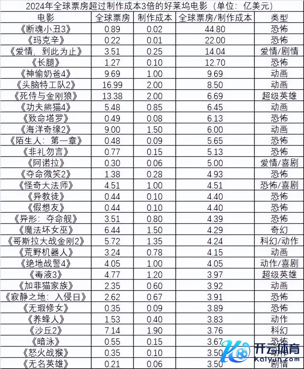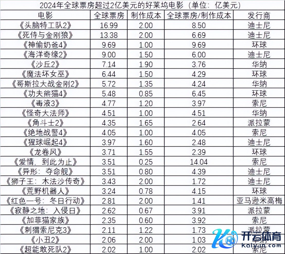 动画以外,最获利的真东谈主电影是迪士尼旗下漫威影业的《死侍与金刚狼》,该片制作资本2亿好意思元,民众票房13.38亿好意思元,民众票房是制作资本的6.69倍。