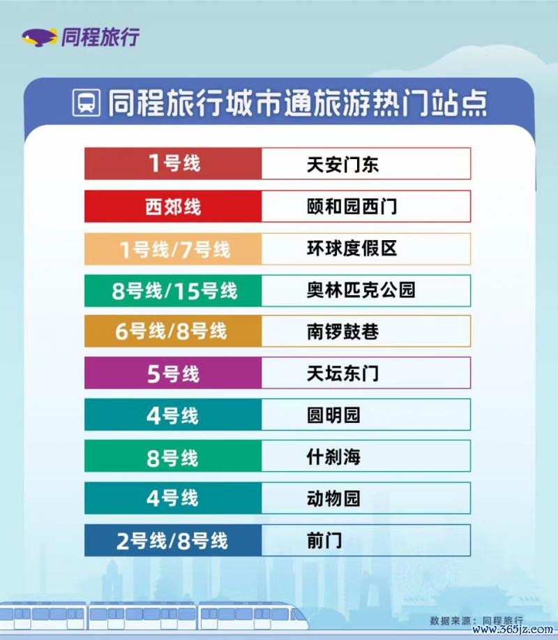 同程旅行城市通形式负责东谈方针磊磊先容,当今城市通旅行用户聚积分散在北京中轴线沿线。其中,天安门东是城市通旅行用户最为都集的地铁站点,其左近分散着故宫、天安门广场、国度博物馆等热点景点,劝诱了多量搭客。奥林匹克公园、南锣饱读巷、什刹海、前门瓜分散于北京中轴线隔壁的地铁站点,均位列城市通用户旅游热点站点榜单前十。
