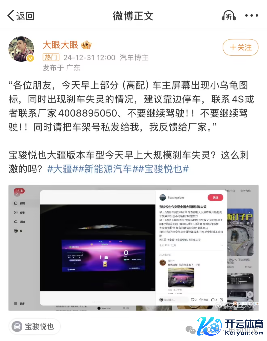 电动知家音信,近日,宝骏悦也高配车型的刹车失灵问题激勉了宽泛柔顺。据多位车主在外交媒体上反馈,车辆在行驶流程中倏得出现刹车失灵表象,样子盘上清楚“黄色小乌龟”故障灯,提醒能源受限。