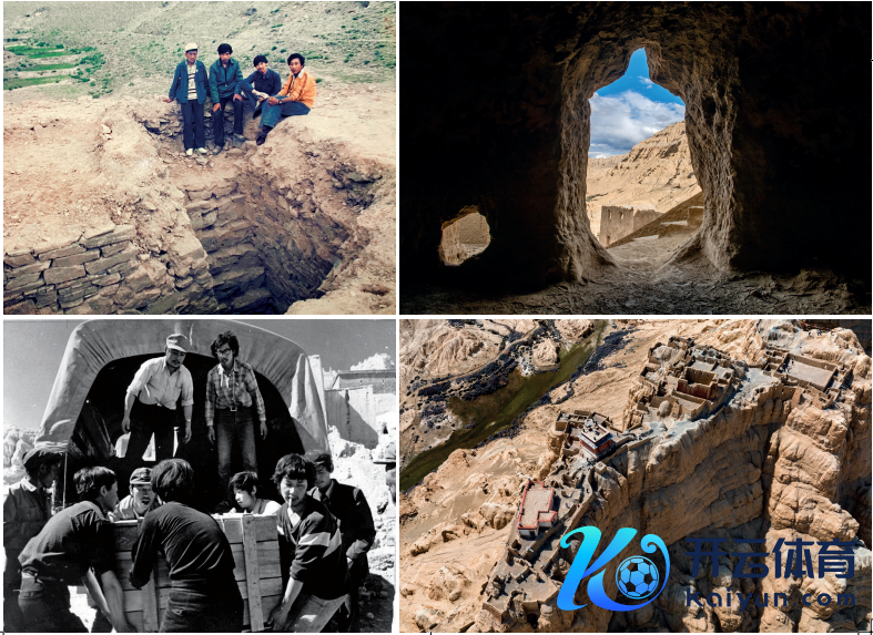 上左图:1985年夏,西藏扎囊县,陕西省援藏文物普查队何周德(左二)与西藏自治区文管会(王福礼,右二)、山南地区(旦增,右一)、扎囊县(平措哲西,左一)的文物干部在发掘斯孔村古墓葬现场。图/受访者提供 上右图:古格王国遗迹甬谈一角(2020年) 图/视觉中国 下左图:1985年6月30日,抵达古格王国遗迹的考古东谈主员正在卸车。车上左为梁宝成,右为张建林。 图/受访者提供 下右图:从高空鸟瞰古格王国遗迹(2023年) 图/中新